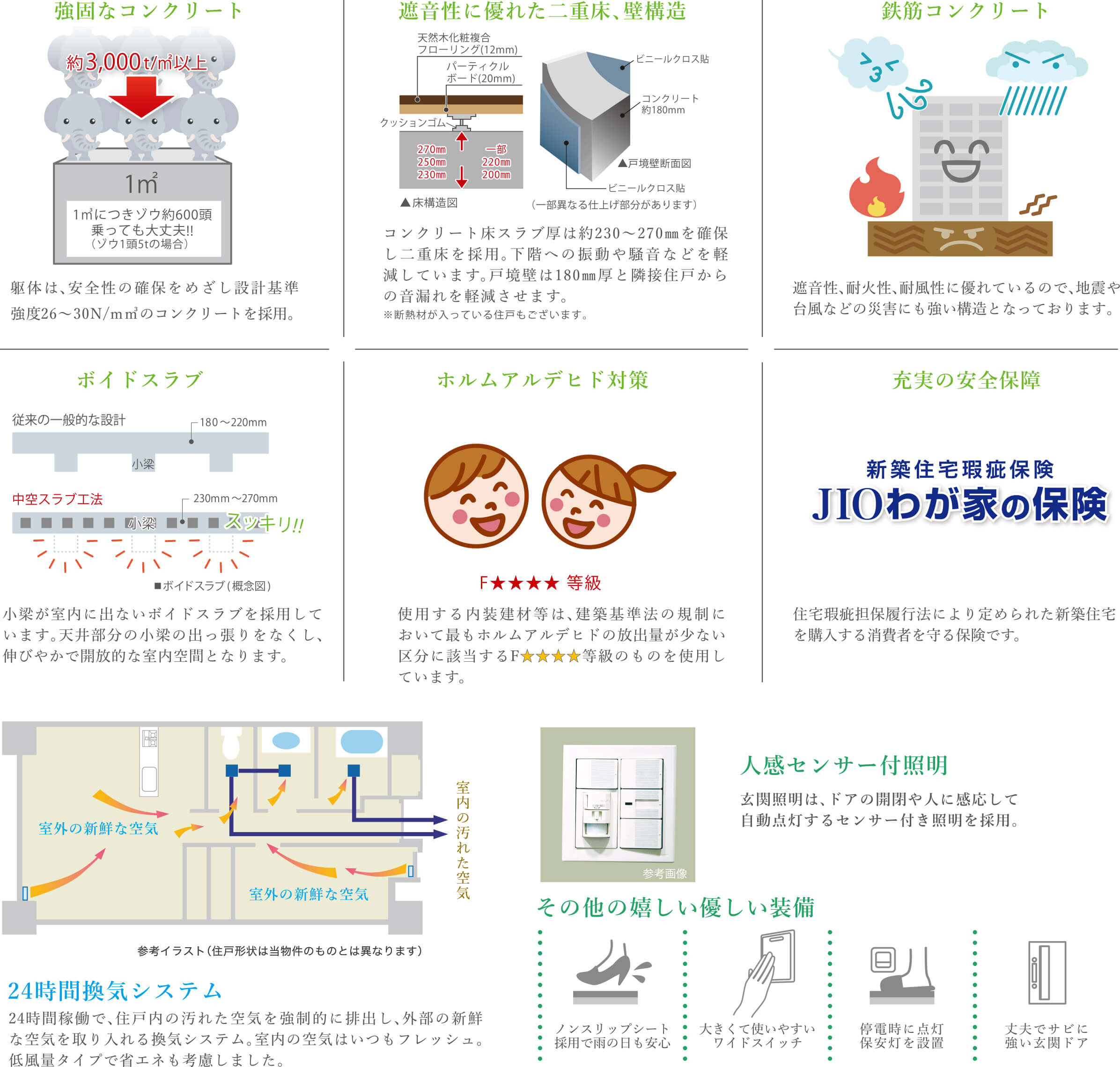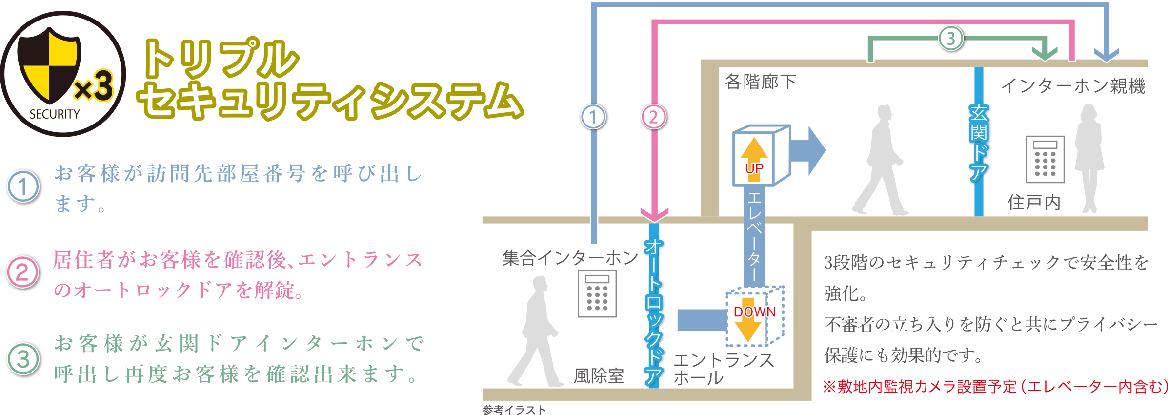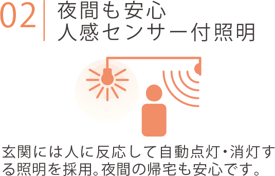 映像と音声で来訪者が確認できる、ハンズフリータイプのインターホンを採用。万が一の非常時にはダイレクトに管理事務室に異常を通知、管理人不在時は管理会社に自動転送するなど警報機能も搭載しています