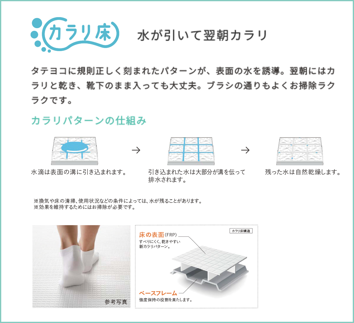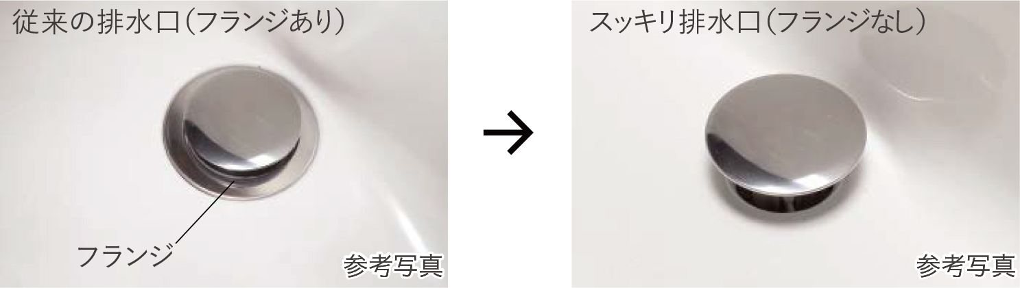 汚れや水あかがたまりやすい浴槽排水口からフランジ(金具)をなくしました。排水口まわりに溝がないスッキリ形状だからお手入れがラクになりました。