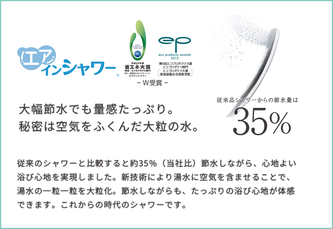 一定の間隔で水に空気を含ませ水玉を大粒化することで、節水を実現。少ない洗浄水でもしっかりとした洗い心地が特長です。(おしり洗浄のみ) -