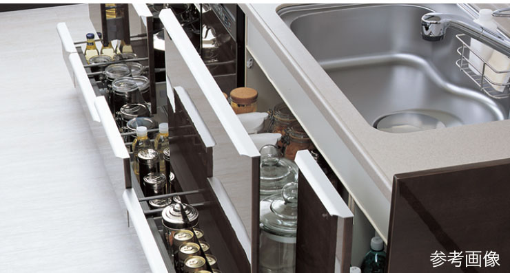 大きな鍋も収納できるスライド収納、小物類も快適に収納できる3段スライドキャビネットと合わせて大容量の収納スペースを確保しています。